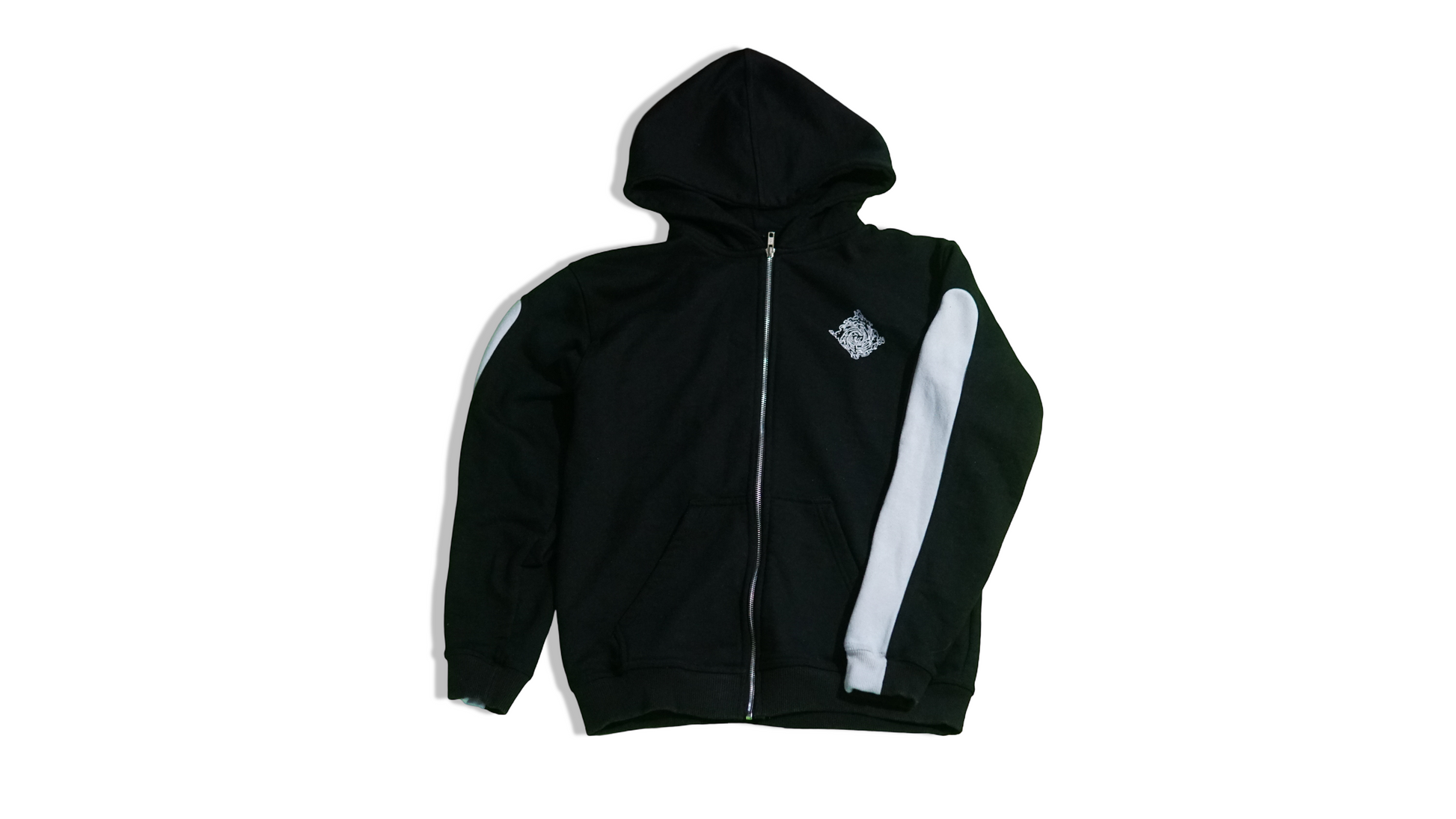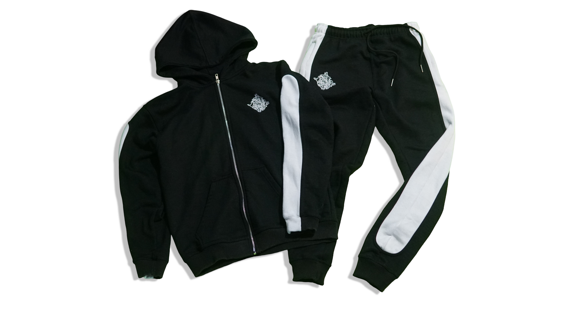Cotton-fleece black tracksuit with round-ended white side stripes. Zippered metal-pocket pants and matching top, both feature embroidered Love Burn logos.